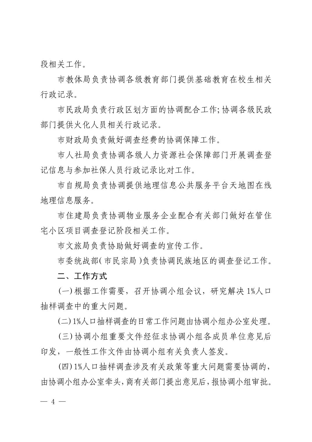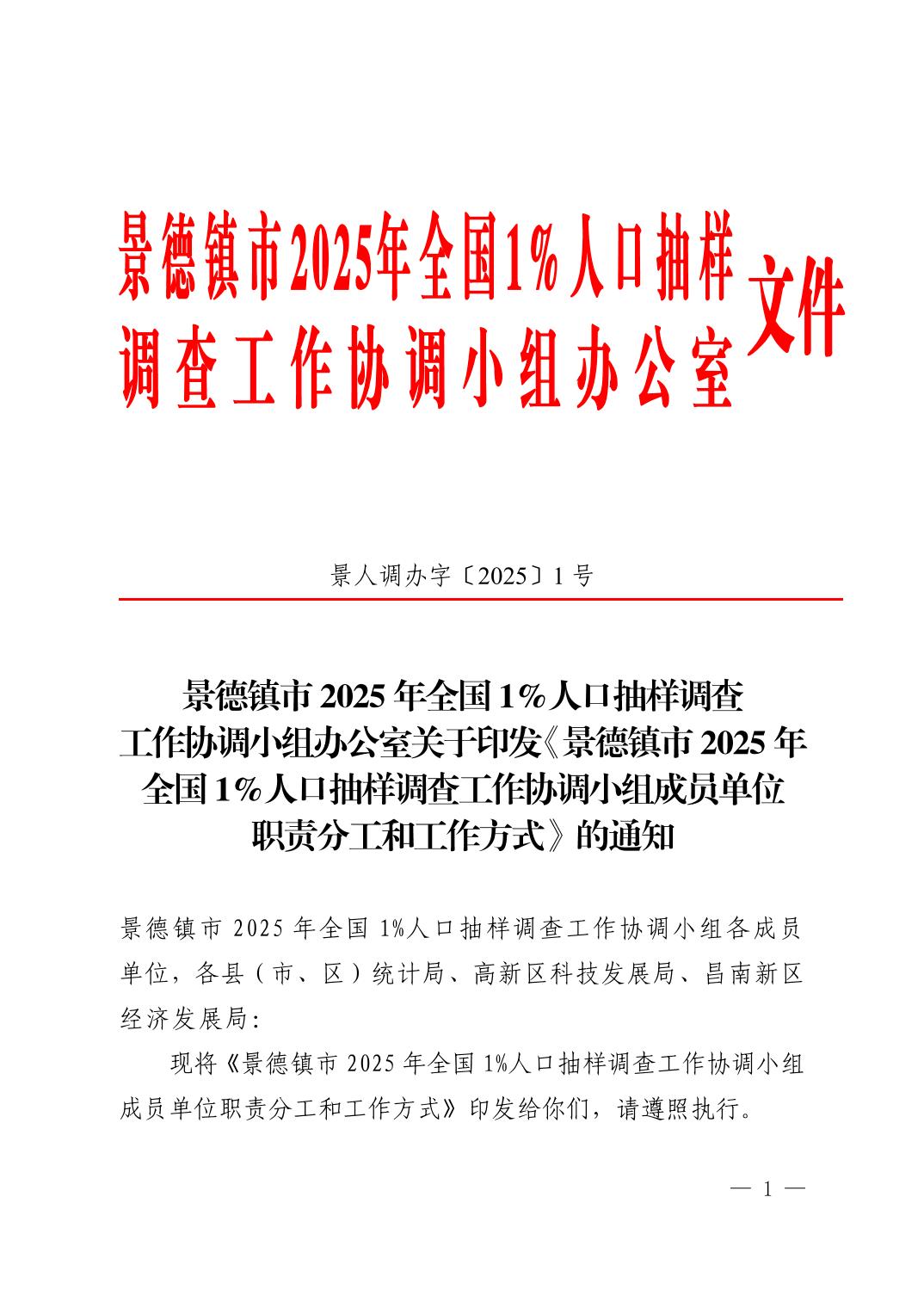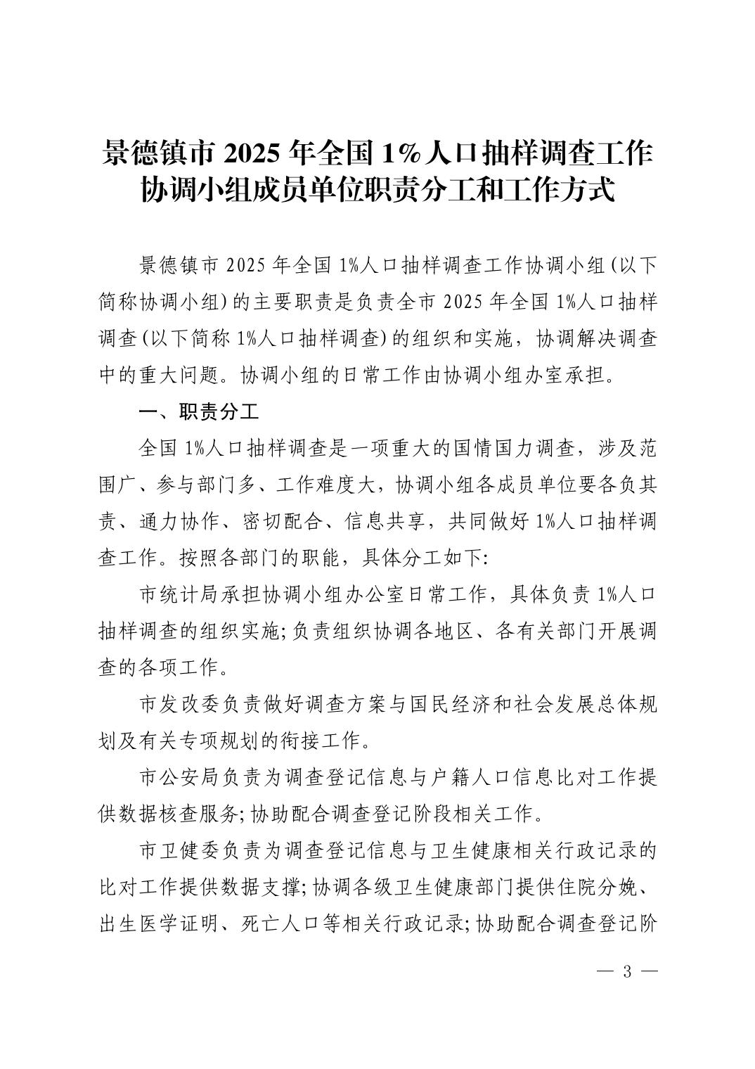 景德镇市2025年全国1%人口抽样调查 工作协调小组办公室关于印发《景德镇市2025年全国1%人口抽样调查工作协调小组成员单位 职责分工和工作方式》的通知