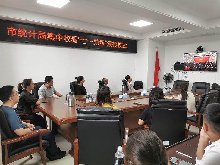 6月29日上午10时,景德镇市统计局组织全体党员干部,集中观看了中央一台庆祝中国共产党成立100周年“七一勋章”颁授仪式实况。认真聆听了习近平总书记的重要讲话,铭记了29名荣获“七一勋章”党员的先进事迹。大家纷纷表示:要以他(她)们对党忠诚、担当有为、为民服务、作风过硬、廉洁奉公上为标杆、为榜样,努力做好自己的本职工作,为统计事业发展接续奋斗。