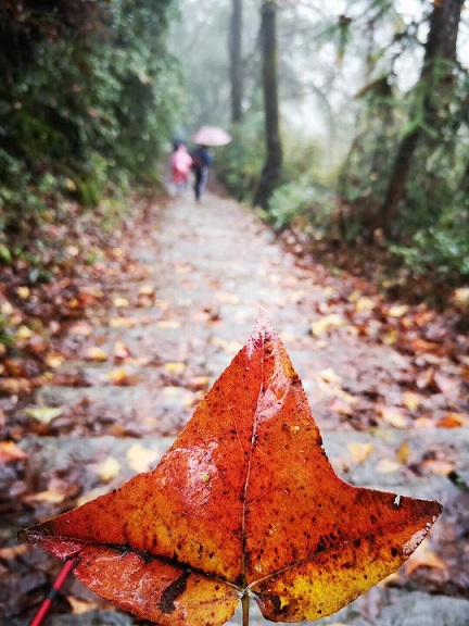 风过一程,秋走一季,银杏金灿灿、枫叶红艳艳,又是一年秋意浓。一群热衷于户外的朋友,踏着深秋的脚步,冒着小雨徒步长溪古驿道,穿越去长溪赏红叶,全程17km。我们坐着大巴在岩前下车,开始我们的徒步之旅。